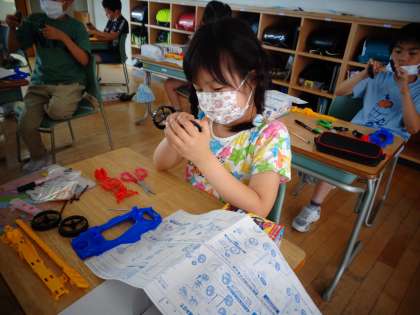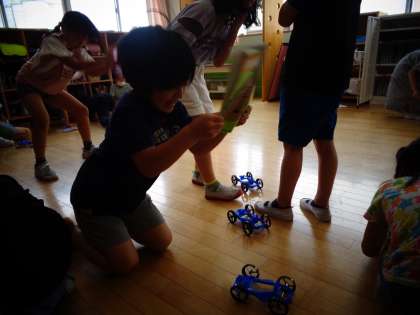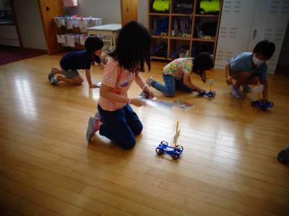 理科の学習では、風で動く車を作って、動かしました。帆をつけると、前に進む距離が長くなることに気付いていました。