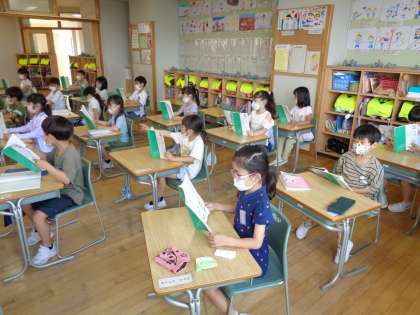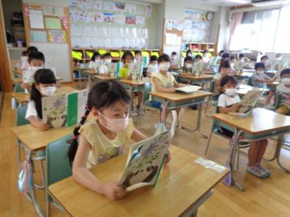 国語科の学習では、母音の「あ」「い」「う」「え」「お」を口の形に気を付けて音読しました。マスクをしていますが、動かしながら、口の形、開く口の大きさが違うことを感じた子供たちでした。