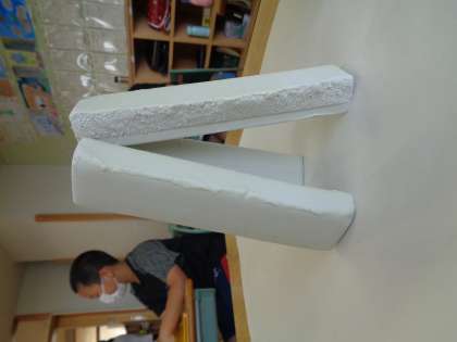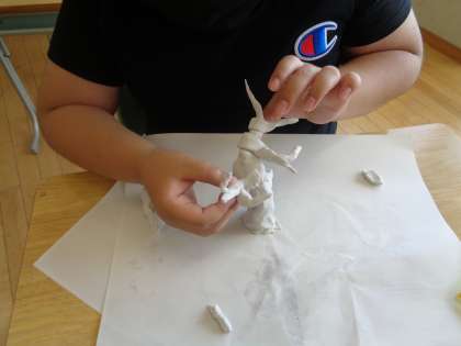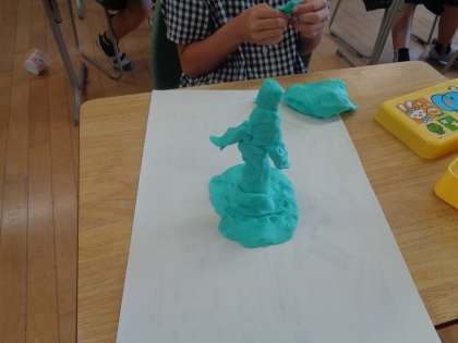 学習参観では、図画工作科「立ち上がれ!ねん土」の学習をしました。どうしたら高さのある作品ができるかを考え、友達の考えを共有し、それを生かして作品をつくりました。子供たちは細かいブロックを積み重ねたり、柱を建てたりして工夫していました。