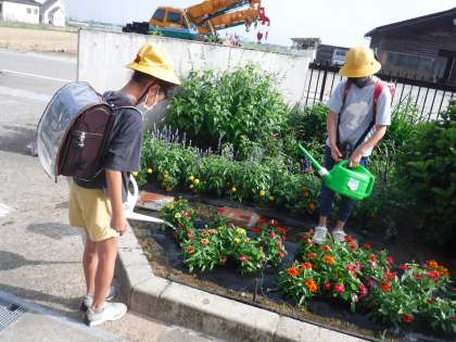 6月22日(水)朝の校庭で 公開日 2022/06/22 更新日 2022/06/22 メール用カテゴリ 登校した子供たちは、自分のアサガオや花壇の花を見に行きます。 観察だけでなく、「どうなったかな」「大きくなったかな」「きれいに咲いているかな」と、心を寄せています。育てている植物に心を向けていることがいいなあと思います。自分以外のものが目に入り、心を寄せ、世話をすることは、すばらしい成長の姿です。 いいなあと感じた朝の校庭でした。