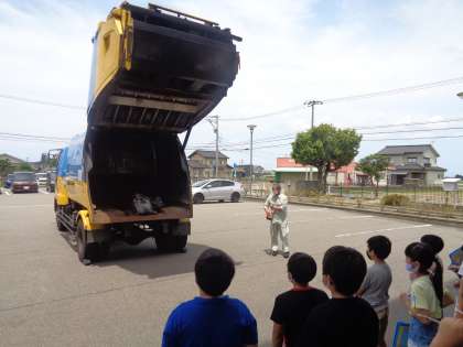 ゴミ収集車を間近で見ながら、ゴミが収集される様子やどんなことに気をつけて仕事をされているのかなどを教えていただきました。子供たちは、普段見ることができない収集車の動きをみて歓声をあげていました。