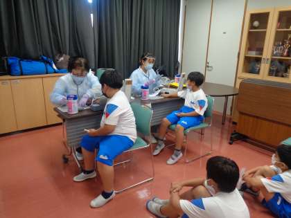 6月28日(火) 4年生 すこやか健診 公開日 2022/07/01 更新日 2022/07/01 4年生 すこやか健診では、腹囲測定や血圧測定、採血が行われました。子供たちの中には血圧測定や採血を初めて受ける子もいて、心配そうにしていましたが、落ち着いて受診していました。