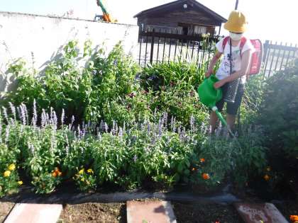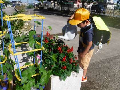学校に到着したばかりで汗が流れている子供たちですが、じょうろを手にして水やりをしています。