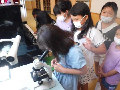 7月1日(金)楽しい広場に 公開日 2022/07/01 更新日 2022/07/01 メール用カテゴリ 児童玄関前の廊下には、ピアノ、みんなの作品コーナー、顕微鏡コーナーがあります。 休み時間に子供たちが訪れて、楽しんでいきます。 子供たちは、アサガオやヘチマ、ヒマワリ等の花粉を観て、形や大きさの違いに驚いていました。