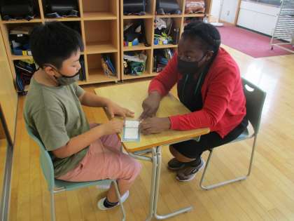 7月7日(木)5年生 「I want to be 〜」 公開日 2022/07/07 更新日 2022/07/07 5年生 外国語科の学習では、将来就きたい職業や、そのために努力する教科をカードに書きました。一人一人が自分の夢を英語でALTの先生に伝えました。