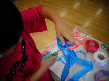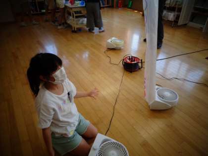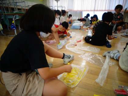 図画工作科「ふき上がる風にのせて」の学習では、袋に絵をかいて送風機で袋を浮かせました。ロープを付けて飾り付けをしている人もおり、楽しみながら活動しました。