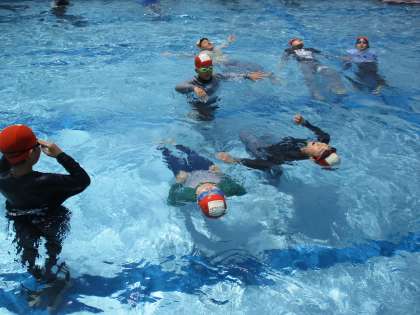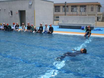 高学年で着衣泳を行いました。服を着たままプールの中に入った子どもたちは、「体が重い」「うまく浮けない」など、思うように体が動かない不自由さを感じていました。