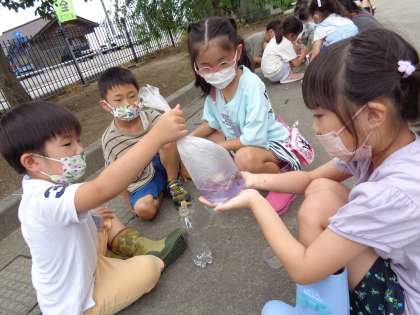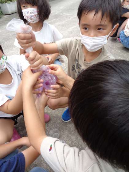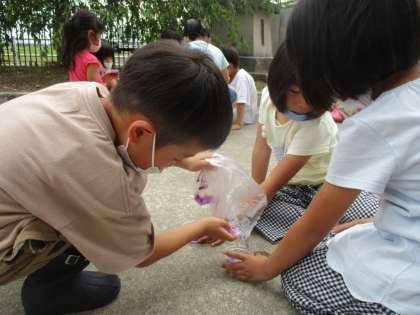アサガオのしぼんだ花を摘んで色水作りをしました。袋に入れて揉むうちに段々と色が出てくるのを見て「きれい」「おいしそう」等の歓声を上げていました。