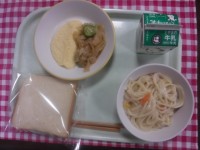 添え野菜には、キュウリとキャベツ、五目味噌汁には、ネギ、玉ねぎ、ジャガイモがたっぷり入っています。一食の給食に、たくさんの野菜が使われて、身体の調子を整えてくれます。