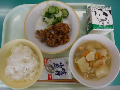 添え野菜には、キュウリとキャベツ、五目味噌汁には、ネギ、玉ねぎ、ジャガイモがたっぷり入っています。一食の給食に、たくさんの野菜が使われて、身体の調子を整えてくれます。