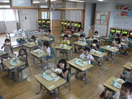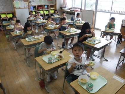 1年生の子供たちは小学校に入学してから、学校給食に慣れ、配膳や片付けもどんどん自分たちで行うことができるようになりました。給食も大好き!もりもり食べています!