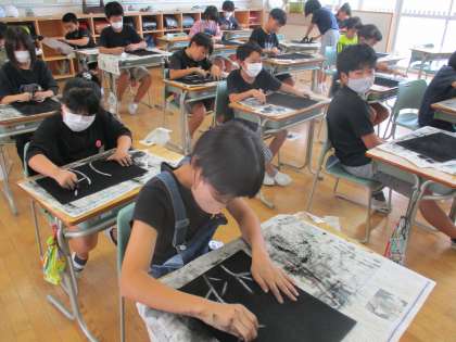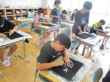 図画工作科では、「消してかく」制作を行いました。コンテを使い、画用紙を黒く塗り、その上から消しゴムで消して線や模様をかきました。画用紙を真っ黒にすることに苦戦して自分たちも真っ黒になりながらも、楽しんで活動していました。