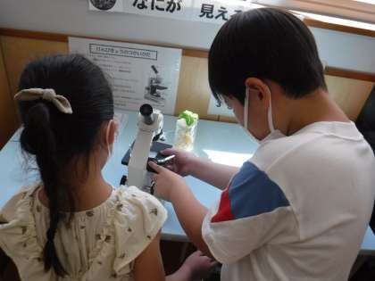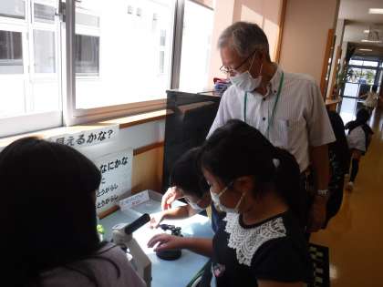 スクール・サポート・スタッフさんからのクイズに4年生の子供たちが挑戦していました。顕微鏡をのぞく子供たちは、