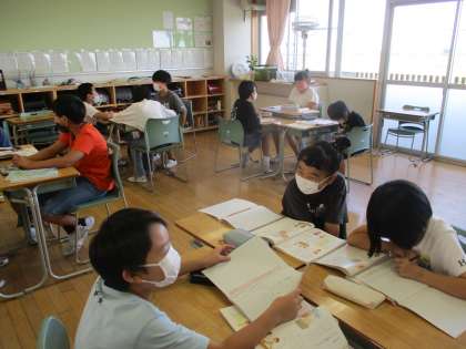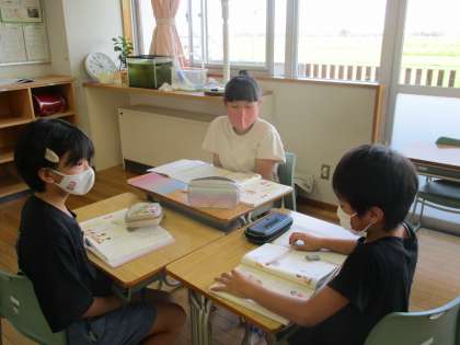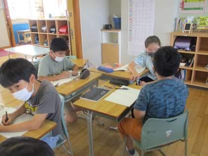 国語科の学習では、「ペットにするなら犬か猫か」「夏休みに出かけるなら山か海か」「タイムトラベルするなら過去か未来か」など、テーマに沿って、二つの立場に分かれて討論を行いました。二つの立場から考えることで、考え方が深まることを学びました。
