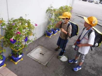 昨日の強い風のためにアサガオを玄関内にしまいましたが、今朝、玄関に並べました。しかし、並べる順番は変わっています。子供たちは、それでもすぐに自分のアサガオを見つけました。