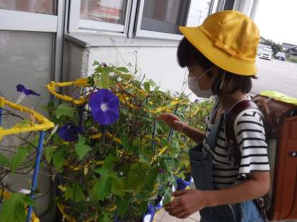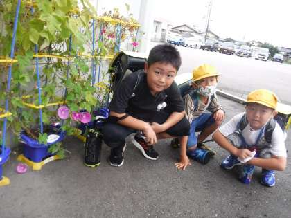 「花が3つ並んでいるよ。三つ子のアサガオだ。僕たちも!」