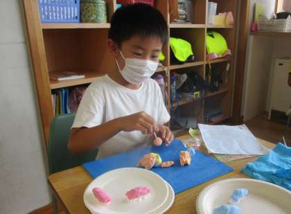 図画工作「ごちそうパーティー」では、粘土で好きな食べ物の形を作り、色を塗ってお皿の上に盛りつけました。同じ食べ物でも色や形、大きさなど、個人の工夫が光る作品になりました。