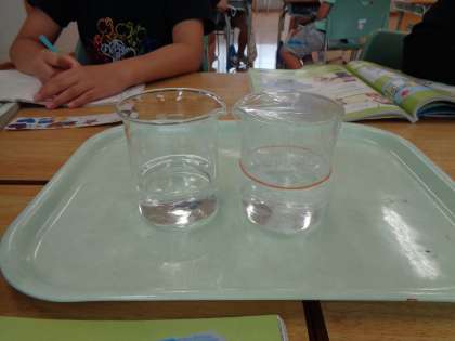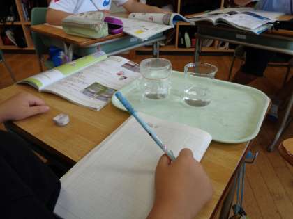 9月9日(金) 4年生 水のすがた 公開日 2022/09/13 更新日 2022/09/13 4年生 理科「自然のなかの水のすがた」では、入れ物に入れた水が空気中に出ていくか調べています。子供たちはビーカーの中の水を比較して、観察していました。