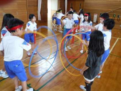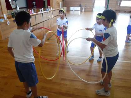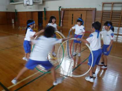 9月13日(火)3年生 体育科 フラフープを使って心を合わせて 公開日 2022/09/13 更新日 2022/09/13 メール用カテゴリ 体育科の学習で、ラダーやミニハードル、フラフープを使って学習しました。 「技も大切だけど、心を合わせることも大切だ!」 と、活動後に感想が出ました。 最後に色団ごとにフラフープの技を発表しました。 輪を使って和が感じられました。