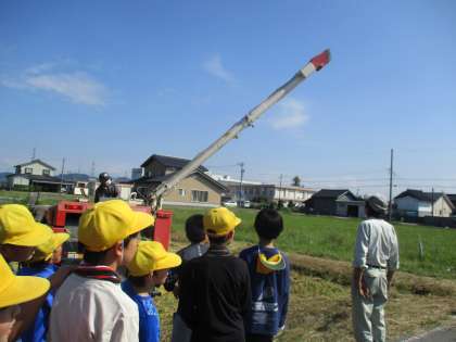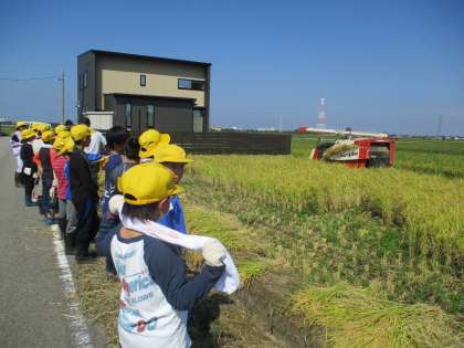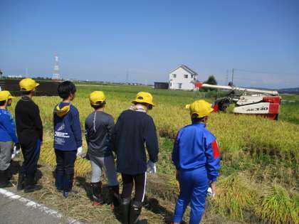 稲刈りと同時に脱穀する機械を見て、子どもたちは「すごい」「社会で勉強した!」と感心の声をあげていました。機械からお米が出てくると、歓声をあげていました。