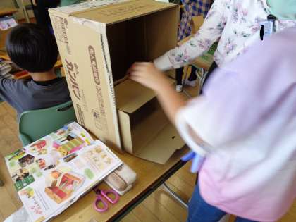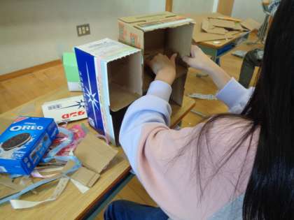 10月11日(火) 4年生 おもしろ段ボールボックス 公開日 2022/10/12 更新日 2022/10/12 4年生 図画工作科「おもしろ段ボールボックス」の学習では、段ボールを切って、自分だけの使って楽しい小物入れを作っています。子供たちは、段ボールの形を活かしたり、仕切りを作って工夫したりして楽しみながら製作していました。