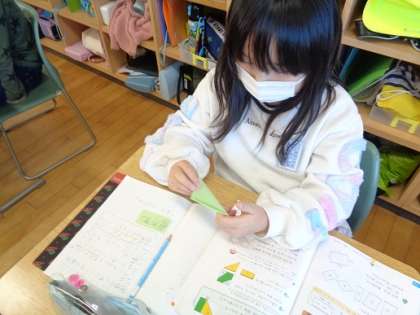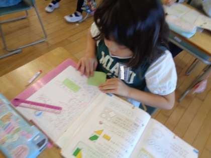 今日は、正方形を調べました。角や辺の長さに注目しています。図形を折ったり角を調べたりしている様子です。4つの角がみんな直角、辺の長さがみんな同じであることを見つけました。