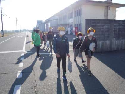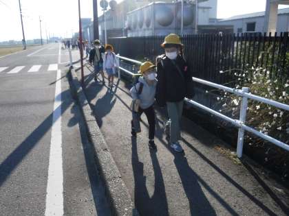 まぶしい朝日を浴びて子供たちが登校してきました。
