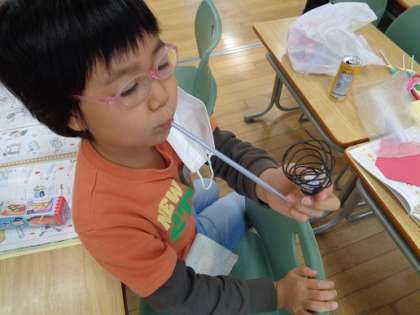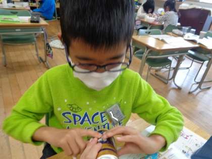 生活科では、教科書や本を見たり友達と相談したりしながら「うごくおもちゃ」作りに取り組みました。作り方の手順が難しくてよく分からなかったり、完成したと思ったのも束の間、ちゃんと動かなかったりと悪戦苦闘を乗り越え、試行錯誤しながらうごくおもちゃを作り上げた喜びはひとしおでした。