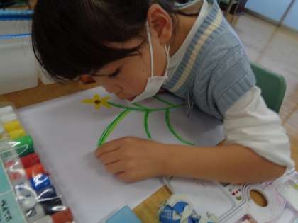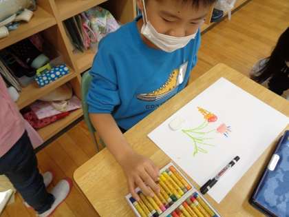 図画工作科では、「ふしぎなたね」を描いています。不思議な種を作り、そこから何が咲くかを考えました。子供達は、お話を想像しながら描いていました。