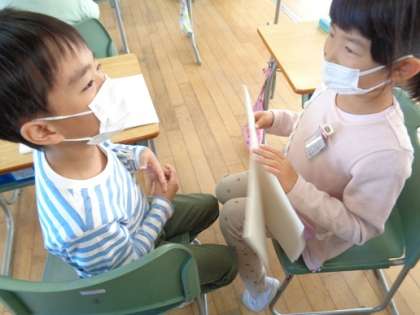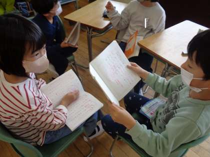休日の過ごし方を聞き合いました。友達が作文を読んだ後に、もっと詳しく知るために、質問をしました。「公園で何をして遊んだの」「お弁当の中には何が入っていたの」「気球から見えた景色はどんなのだったの」など、楽しそうに話していました。