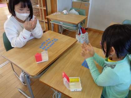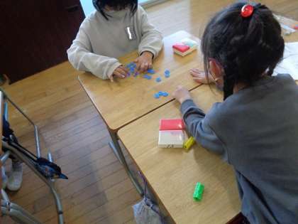 算数科では、かけ算の学習が始まりました。まとまりが「いくつ分」あるかを、おはじきを使って確認しています。友達と問題を出し合っている様子です。