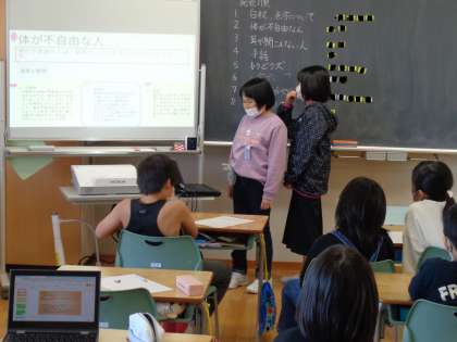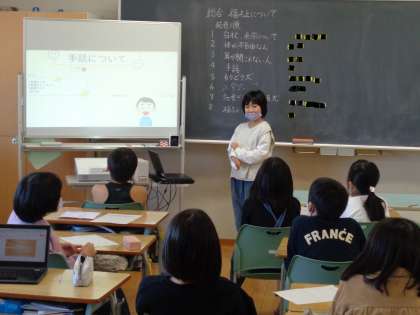 10月31日(月) 4年生 福祉について発表 公開日 2022/10/31 更新日 2022/10/31 4年生 総合的な学習の時間では、福祉について調べてまとめたことを発表しました。子供たちは、社会で活躍する犬には盲導犬だけでなく、介助犬や聴導犬がいることを発表したり、手話のクイズを出したりしました。