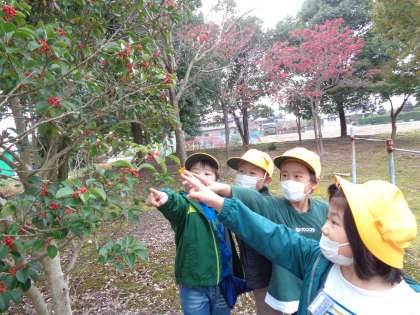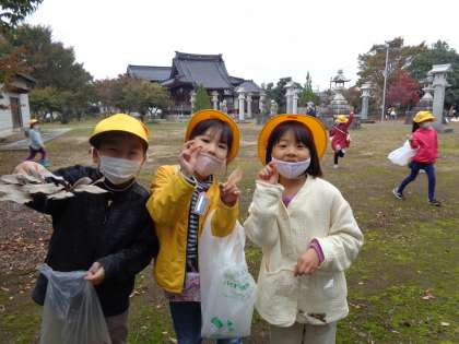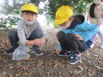 生活科では秋見つけの学習をしています。神社の境内へ行き、どんぐりや落ち葉、木の実等の秋のものを見つけました。