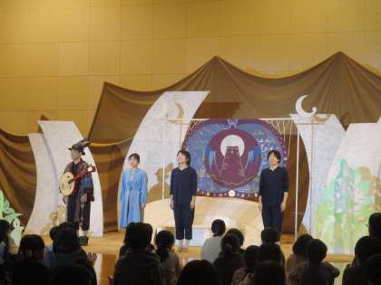 11月8日(火)6年生 演劇鑑賞会 公開日 2022/11/11 更新日 2022/11/11 6年生 劇団風の子中部の「ユエと瑠璃色の石」とい劇を見ました。6年生は、学習発表会で自分たちも劇を行い、演技・演出を考えていたという経験があったため、鑑賞後の感想には演技についての内容が多く書かれていました。4人だけで役を兼ねて行っていることの素晴らしさや、動物や木々に至るまで役になりきっていることのかっこよさなど、プロの技に惹かれていました。