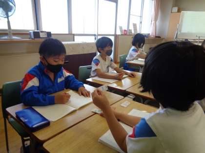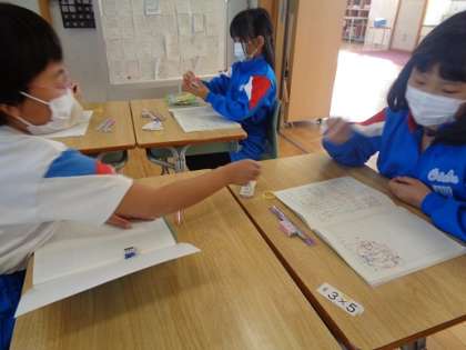 算数科「かけ算」では、5の段まで学習しました。九九カードを使い、ペアで九九ビンゴをしている様子です。