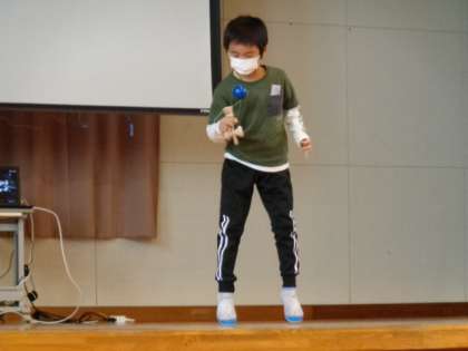 下段・・・「♪もしもしかめよ」のリズムでけん玉を披露する1年生