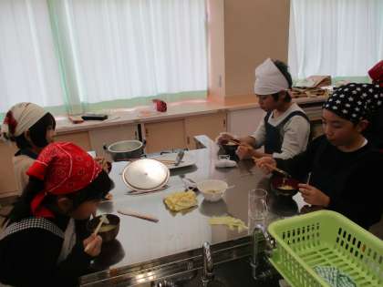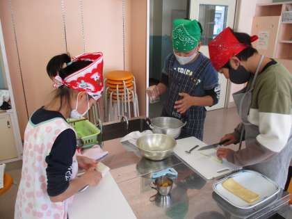 4回目の調理実習となると、班のみんなと協力して準備片付けを手際よく行ったり、安全に気を付けて包丁やガスを使ったりと、教師に声をかけられなくても、自分たちで考えて行動できる姿が増えていました。