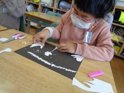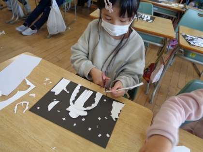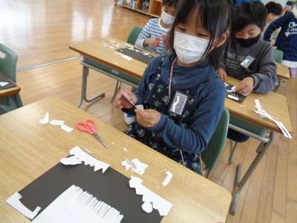 図画工作科「はさみアート」では、白い画用紙を切って、黒い画用紙に貼りました。いろいろな形を作り、黒い画用紙の上で動かしながら、作品をつくっていました。