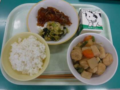 「関東炊き」には、にんじん、こんにゃく、じゃがいも、いんげん、かまぼこ、がんもどき等の材料が炊かれています。根菜がほくほく煮込まれ、出汁がよくしみて、とてもおいしくご飯に合いました。明日の給食もお楽しみに。