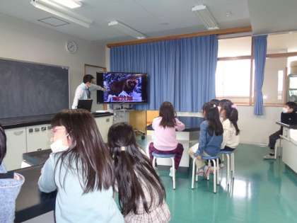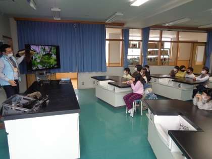 悠久の森出前授業として、ファミリーパークから講師の先生方をお招きし、呉羽丘綾に住む生き物についてお話をしていただきました。子どもたちは真剣に話を聞き、北陸の宝物であるホクリクサンショウウオが絶滅の危機にあることに驚いていました。
