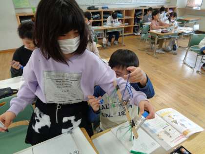 算数では天秤を使ったり、手で持ったりしながら物の重さを調べています。どちらが重いか見当をつけ、ペアで協力して重さの比較をしています。