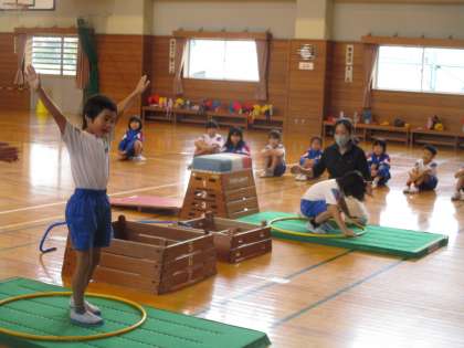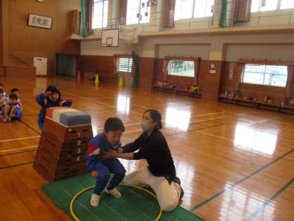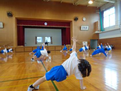 1年生は体全体を動かす体操運動を中心に教えていただきました。先生の話をよく聞いて真似をしたり、リズムにのってジャンプしたりしながら跳び箱の着地につながる練習に取り組みました。