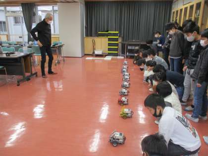 子どもたちがPC上でプログラムを組み、そのプログラム通りにロボットを動かす活動をしました。初めて見るロボットに大喜びの子どもたちです。