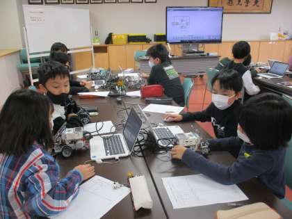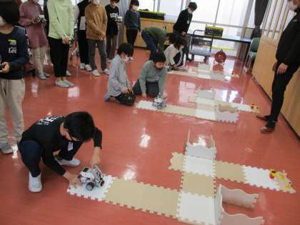 昨日の続きで、支援物資を届けた後、箱を持ち帰るプログラムを組みました。今回は新たに超音波センサを使って、壁を察知し、自動ブレーキをかけるプログラムも教えていただきました。何度も何度も試行錯誤しながら、意欲的に挑戦する姿が多く、失敗しても諦めずに粘り強く取り組む大切さも学びました。