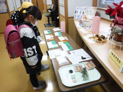 児童玄関前に、イラスト・工作・手芸クラブのみなさんの作品が展示されています。