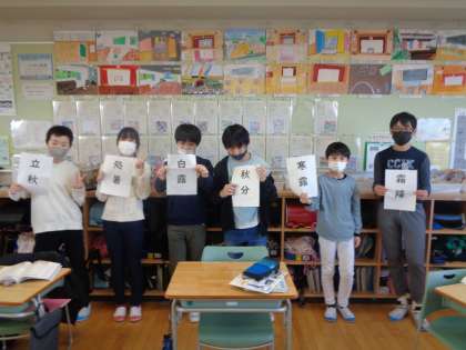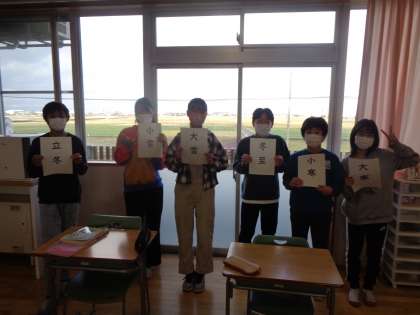 春の「穀雨」と夏の「芒種」がつながっていること、夏の「小暑と大暑」と冬の「小寒と大寒」があること、四季の始めに季節が「立つ」ことなど、楽しく季節に関する言葉を学習しました。昨日が「小雪」であると知り、2週間後の「冬至」を楽しみに待つ子供たちでした。