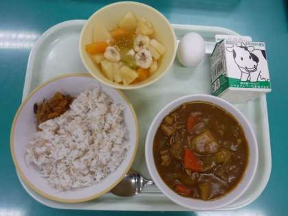 子供たちに大人気のカレーライスは、ジャガイモ、にんじん、玉ねぎがたっぷり入っています。甘口と辛口のカレールウがバランスよくミックスされていて福神漬けにもゆで卵にも合いました。