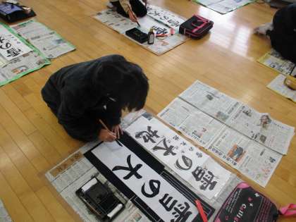 12月19日(月) 5年生 書初練習 公開日 2022/12/19 更新日 2022/12/19 5年生 書初大会に向けて、練習を進めています。 本番通り新聞紙を広げて、一筆一筆丁寧に書きました。太く、大きく、のびのびと書かれた字が出揃いました。