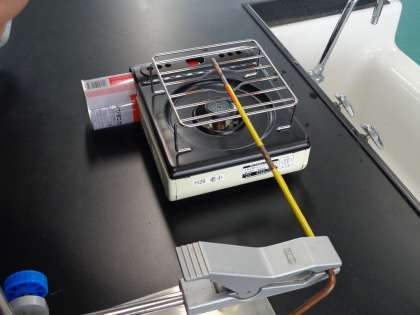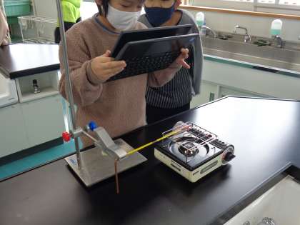 12月21日(水) 4年生 金属のあたたまり方 公開日 2022/12/22 更新日 2022/12/22 4年生 理科「物のあたたまり方」の学習では、金属はどのように温まっていくのか予想し、調べました。クロムブックで温まっていく様子を録画して、実験記録をとりました。