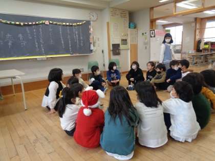 「クリスマスお楽しみ会」を行いました。役割分担や計画、進行も自分たちで行いました。2学期の楽しかったことやがんばったことを発表しており、「体育でのサッカーが楽しかった」「九九マスターになるために、たくさん練習したよ」と話していました。